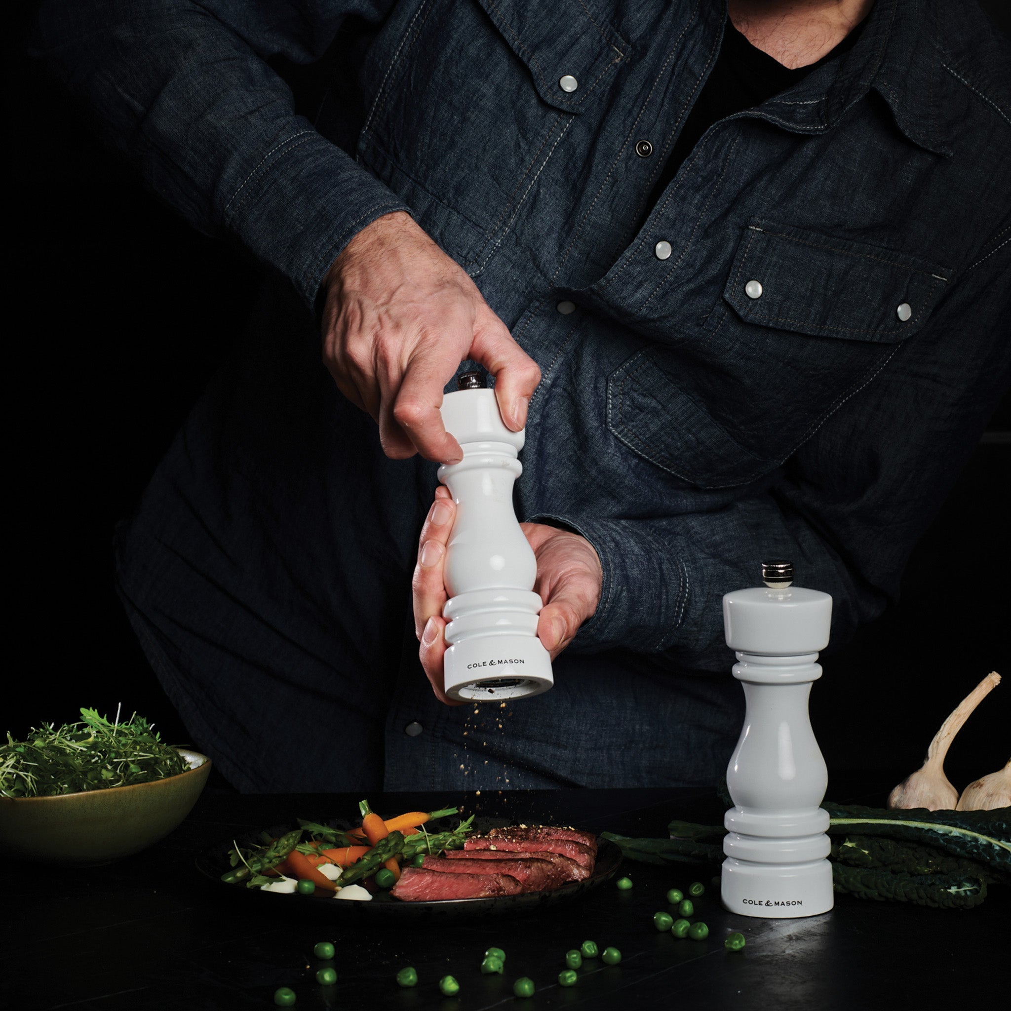 The London White Gloss Salt & Pepper Mills feature a sleek, high-gloss finish on premium beech wood, offering a contemporary yet sophisticated touch to your kitchen or dining table. With an adjustable grinding mechanism, these mills provide effortless seasoning control, ensuring a perfect balance of aesthetics and practicality.