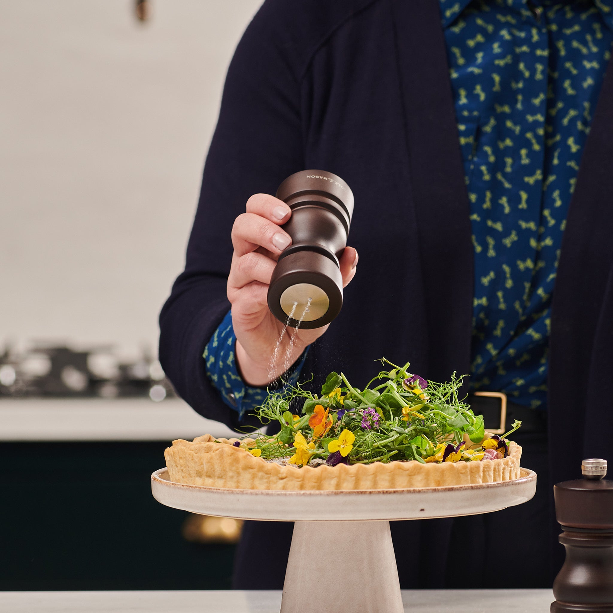 The pepper mill features an adjustable ceramic mechanism for customised seasoning, from fine to coarse—simply tighten or loosen the knob. The salt shaker dispenses evenly for mess-free use.